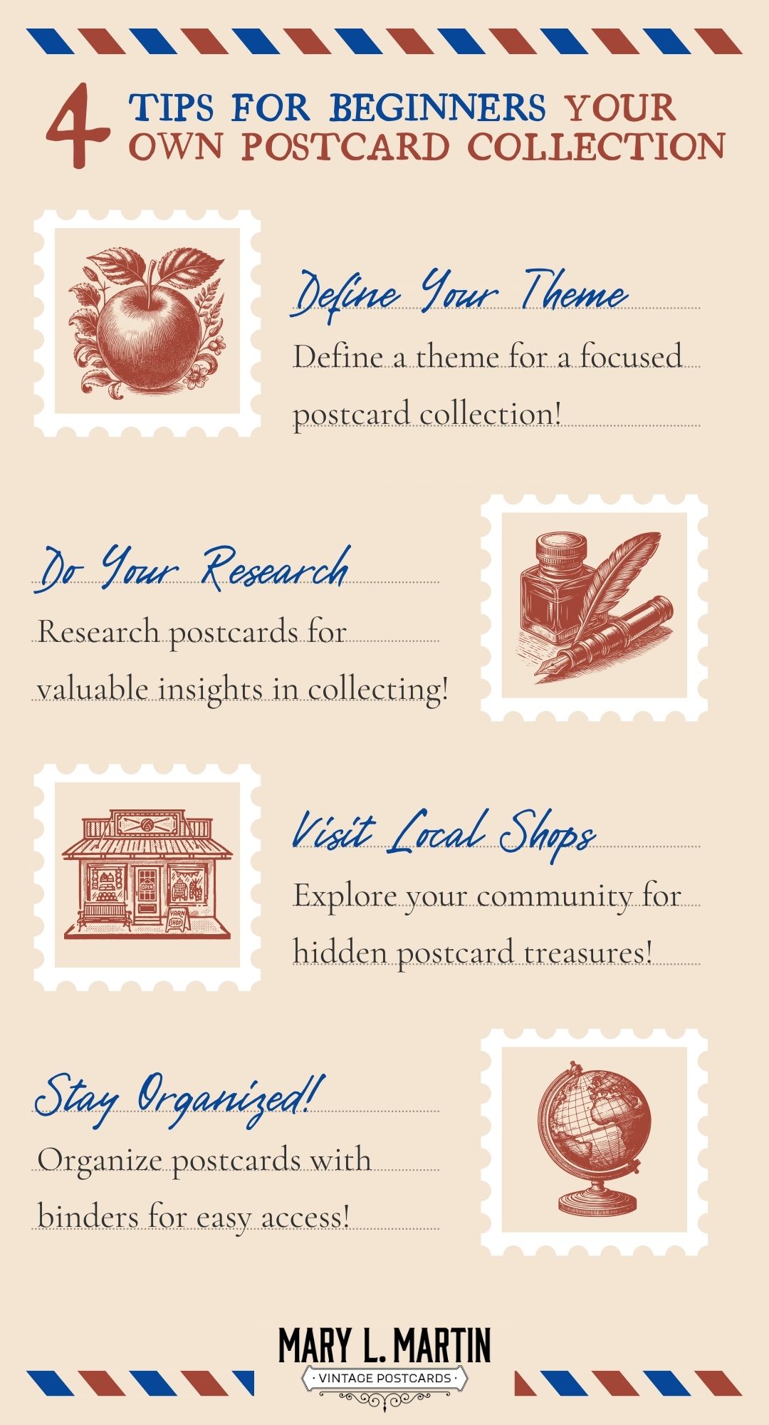 Before starting your postcard collection, we suggest defining a theme, such as vintage postcards of national parks or specific historical eras. A clear focus not only makes your collection unique but also simplifies management as it grows. This thoughtful approach enhances your enjoyment and allows you to explore your interests in greater depth.