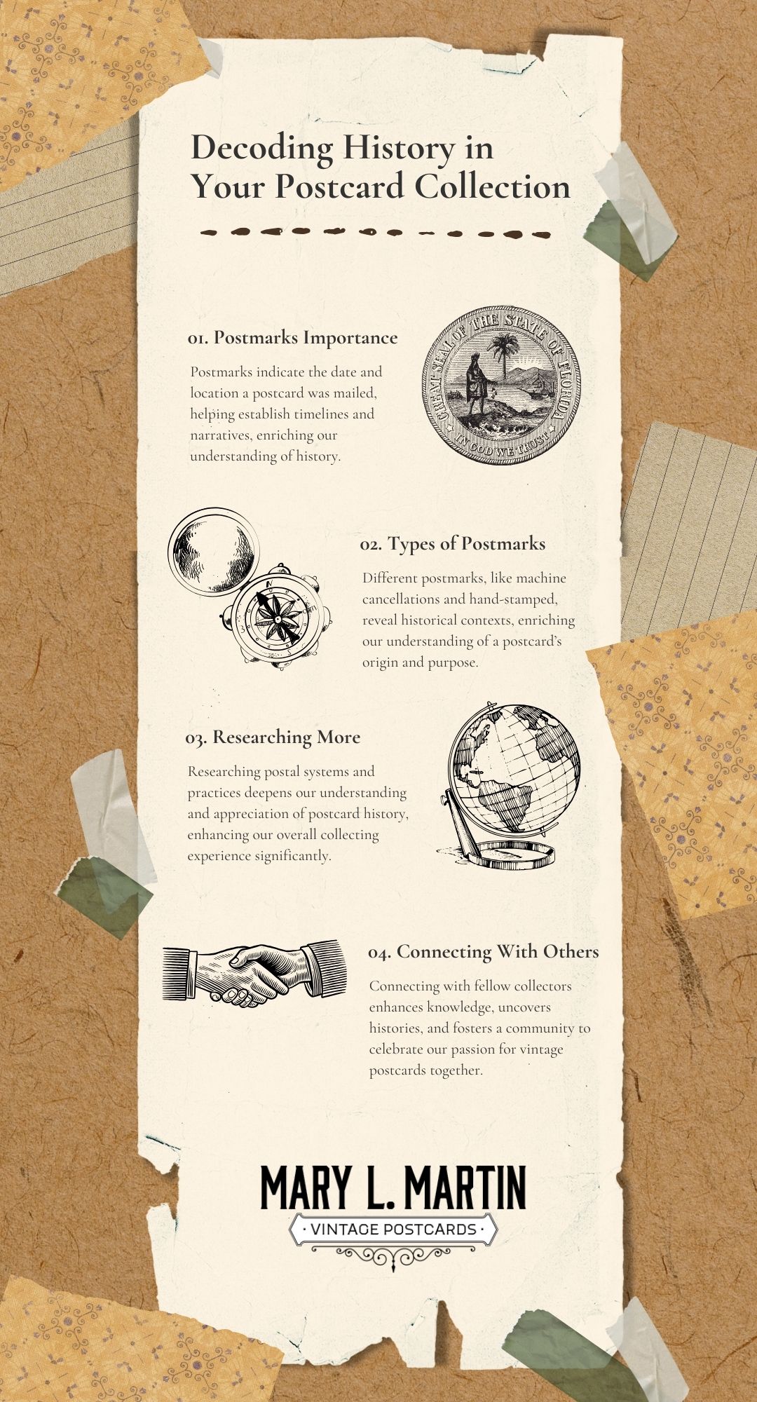 Decoding postcard postmarks not only helps us understand our collection’s history but also fosters a deeper connection to the past. Shop with Mary L. Martin Vintage Postcards to explore our extensive selection of vintage postcards, where each card has its own unique story waiting to be uncovered. Happy collecting!