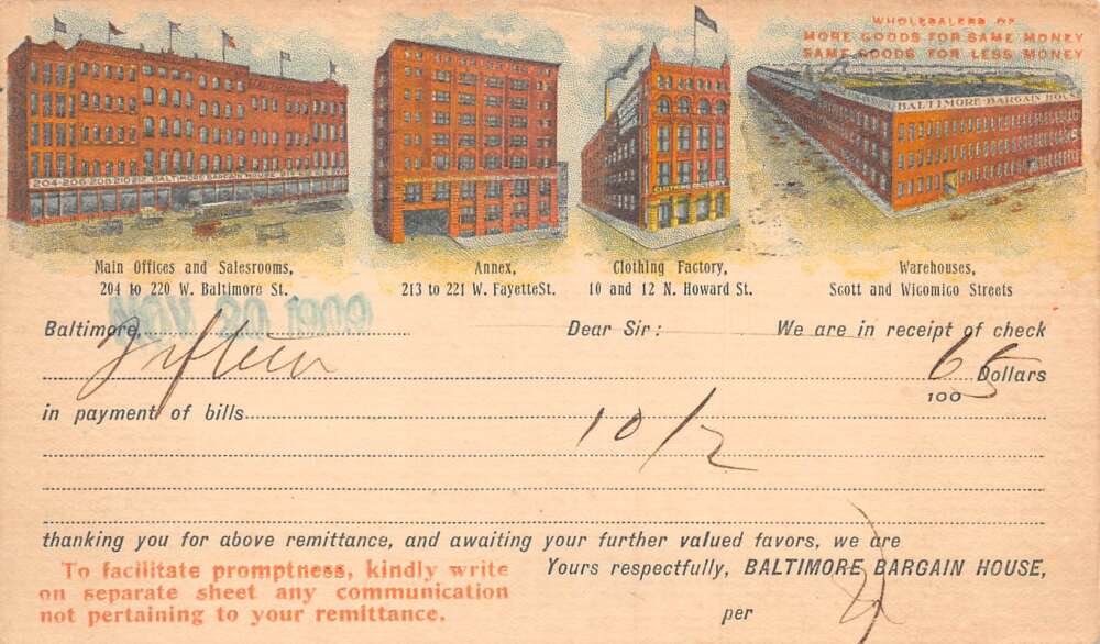 Baltimore Maryland Baltimore Bargain House Offices Factory Postcard AA111992