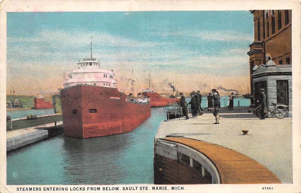 Sault Ste Marie Michigan Steamers Entering Locks from Below Postcard AA111042