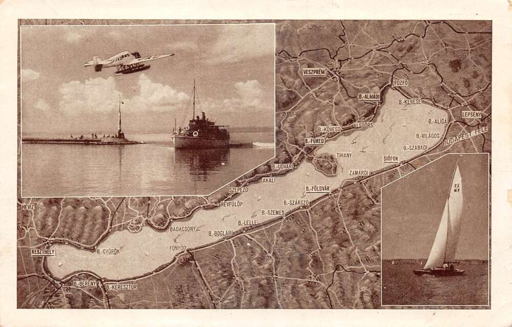 Siofok Hungary Lake Balaton Seaplane Taking Off and Map Postcard AA85367
