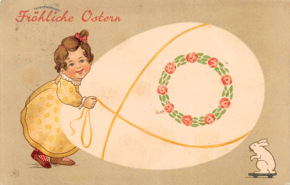 Easter Greetings Girl with Giant Egg Bunny Rabbit on Skateboard PC AA85323