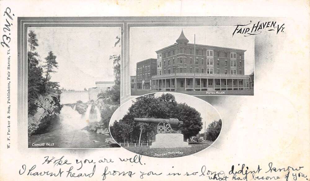 Fair Haven Vermont Carvers Falls Hotel Allen Soldiers Monument Postcard AA85856
