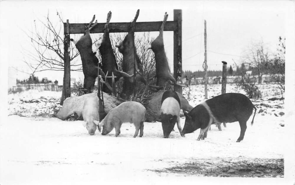 Polson Montana Hunting Scene Deer Hung Up near Pigs Real Photo Postcard AA106722