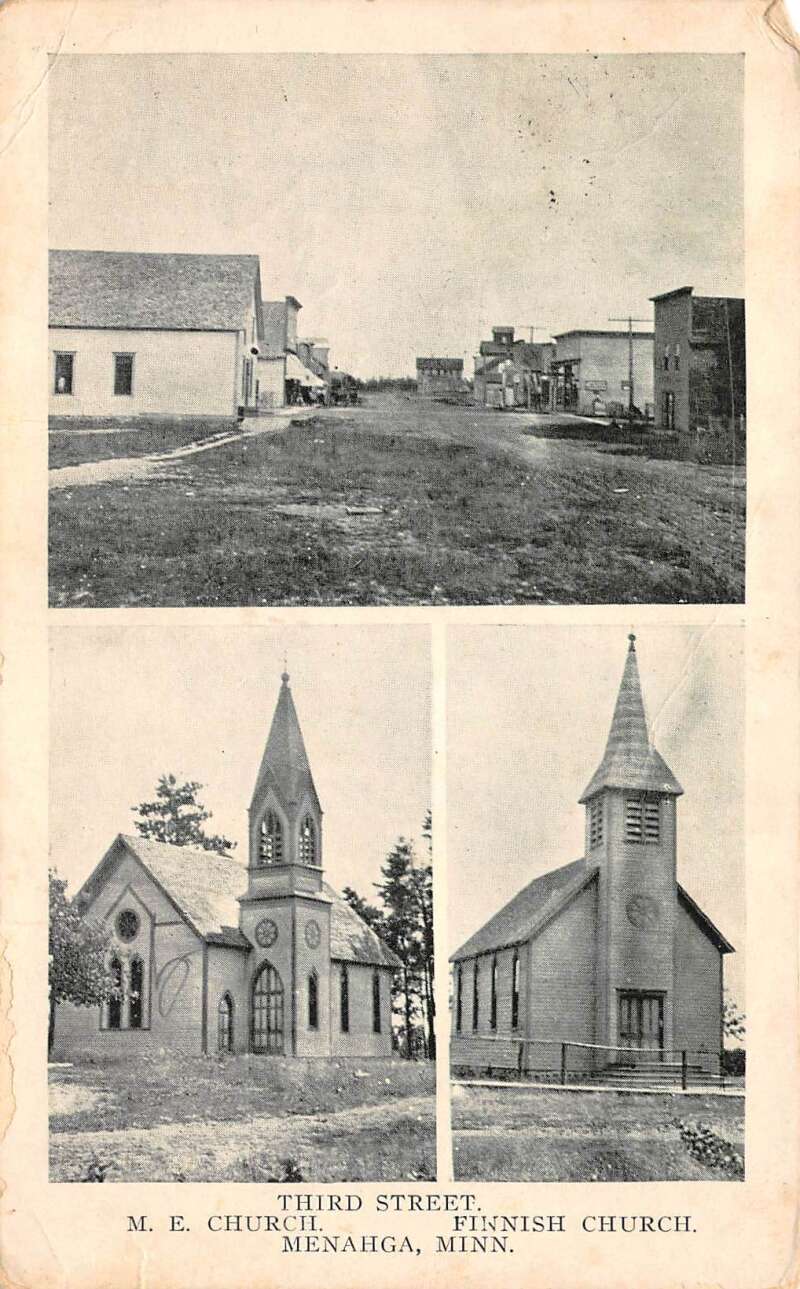 Menahga Minnesota 3rd St., M.E. & Finnish Churches Views, Vintage PC U26400