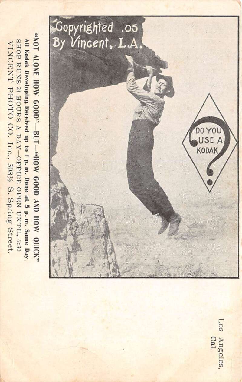 Los Angeles California Vincent Photo Co Kodak Ad Man on Cliff Postcard AA106589