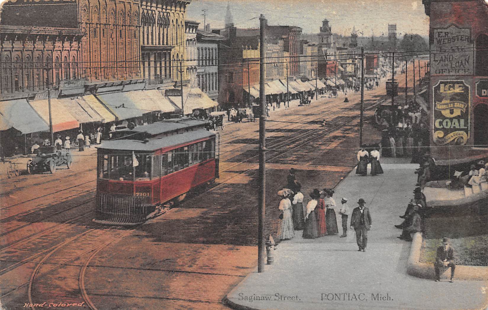 Pontiac Michigan Saginaw St., Trolley, Hand Colored Vintage Postcard U27028