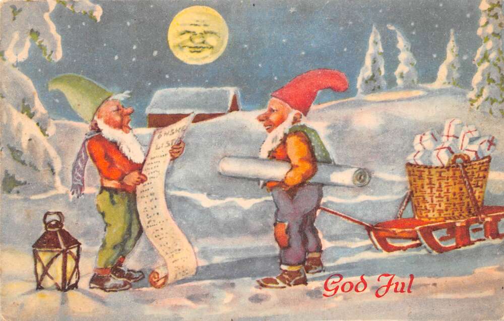 Christmas Greetings Gnomes Elves with List and Boxes Moon Face Postcard AA74136
