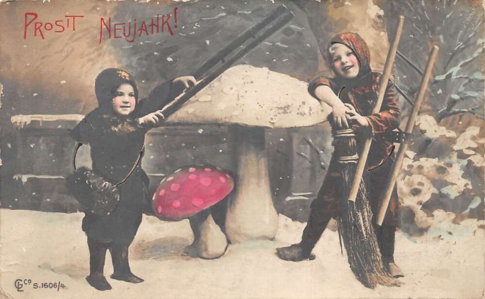 New Year Greetings Children Chimney Sweep Mushrooms Tinted Real Photo PC AA73238