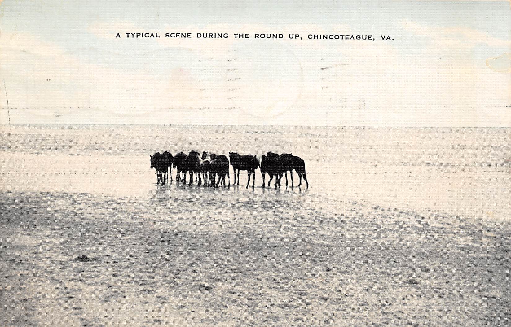 Chincoteague Virginia Wild Horses Round Up Scene, Sky Tinted, Vintage PC U15631