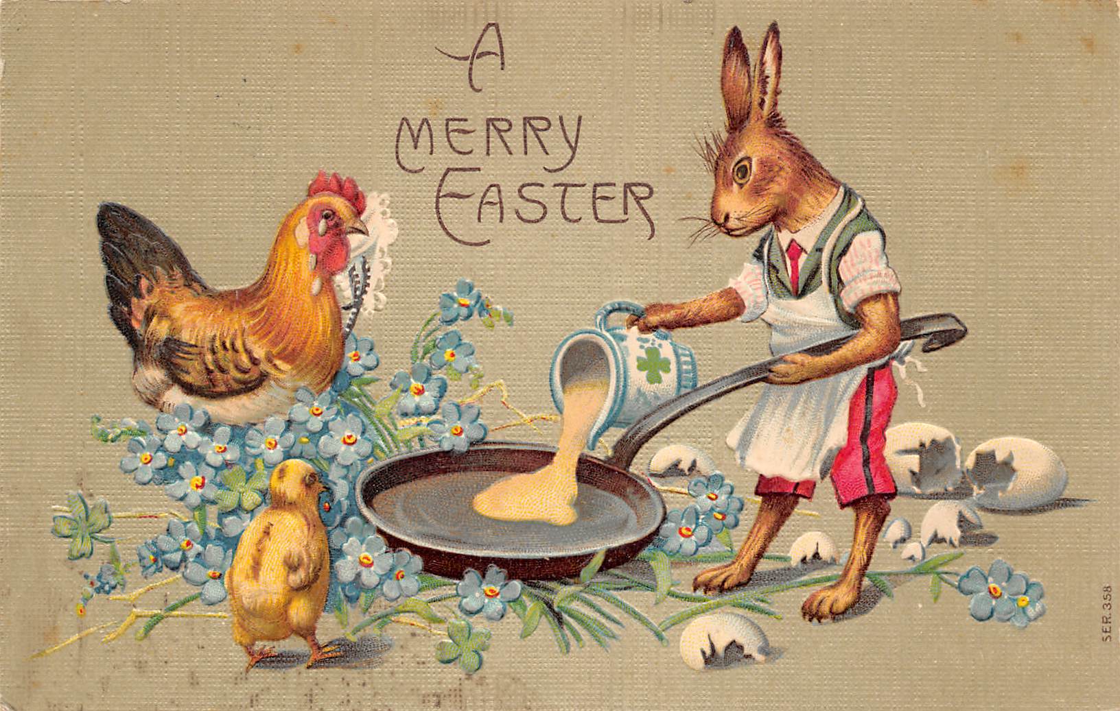A Merry Easter Bunny Cooking Eggs, With Chickens, Vintage Postcard U15944