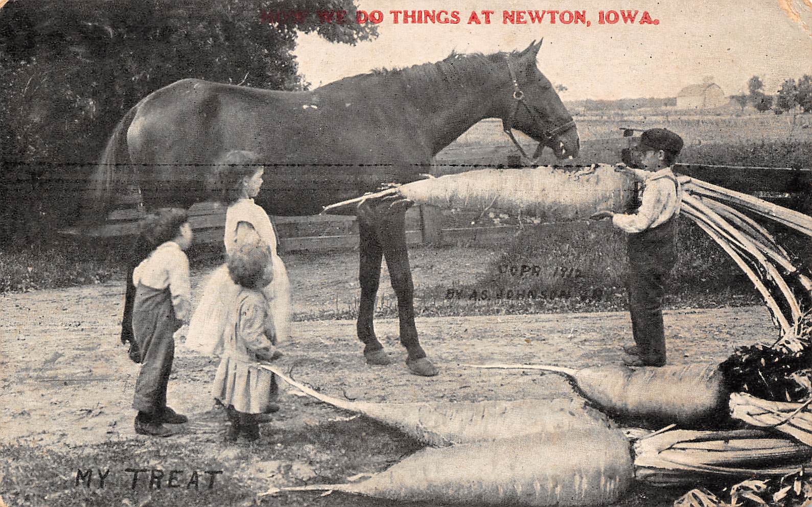 Newton Iowa Kids & Horse W/ Exaggerated Carrots, B/W Lithograph PC U15956