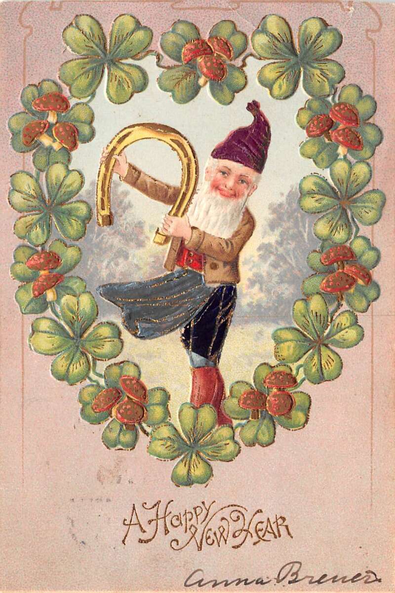 A Happy New Year Elf W/ Horseshoe, Clover & Mushroom Border, Postcard U12499
