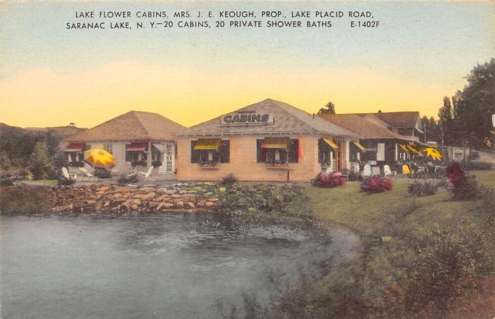 Saranac Lake New York Lake Flower Cabins, Hand Colored Vintage Postcard U12517