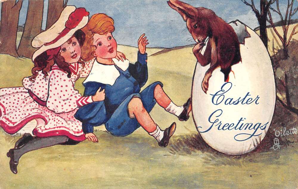 Easter Greetings Children and Bunny Rabbit Tuck Oilette Vintage Postcard AA77837