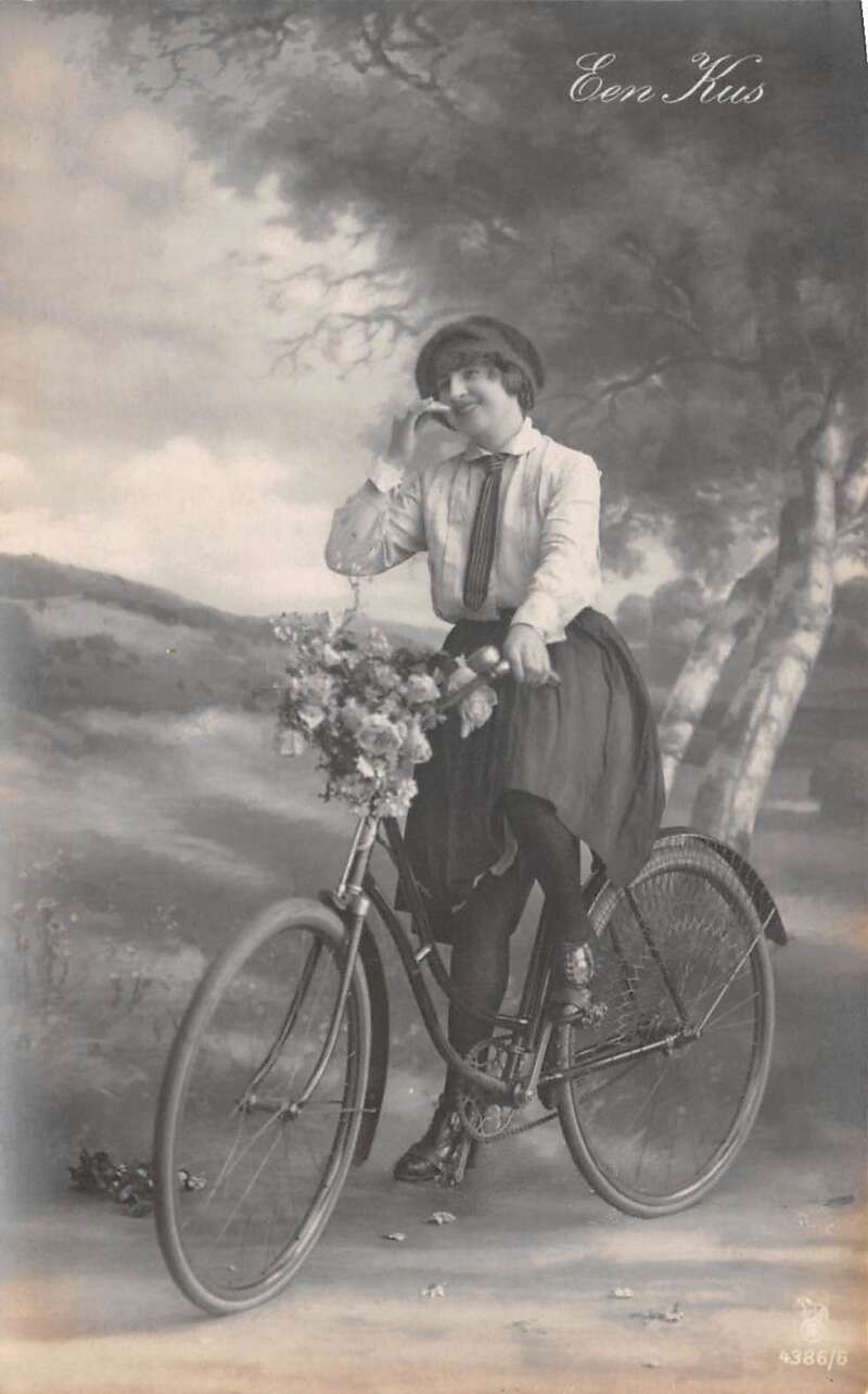 Woman with Flowers Riding Bicycle Real Photo Vintage Postcard AA81631