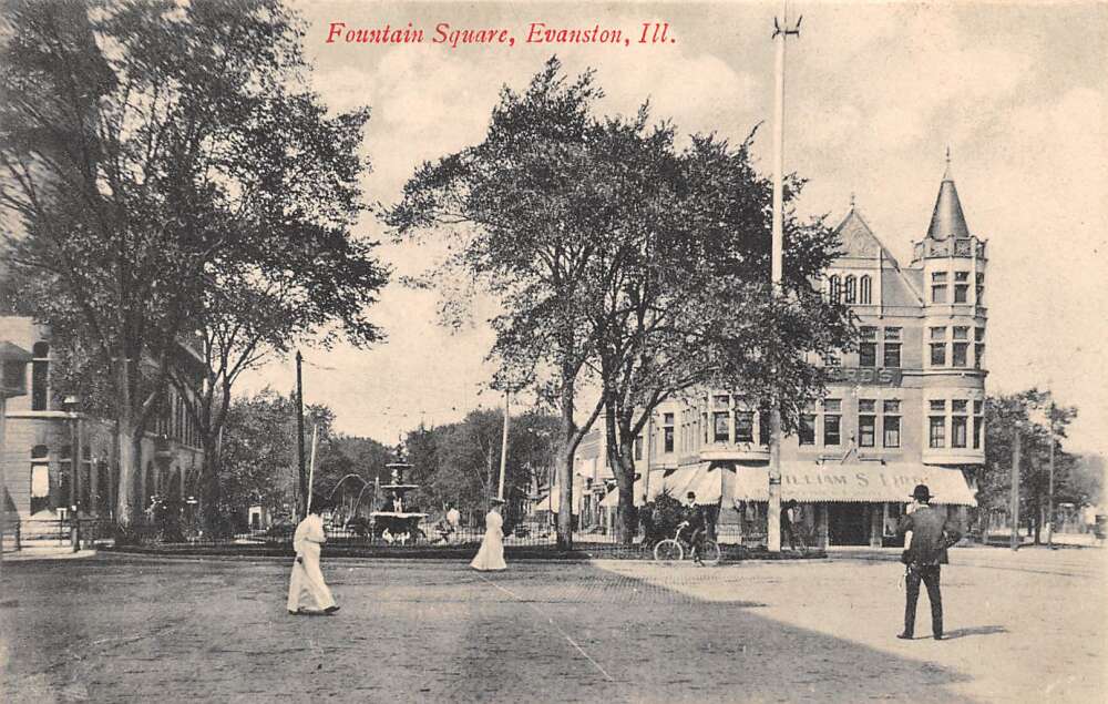 Evanston Illinois Fountain Square, B/W Lithograph Vintage Postcard U17230