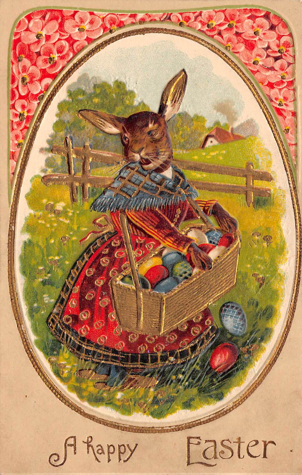 A Happy Easter Dressed Rabbit Woman With Decorated Eggs, Vintage PC U16994