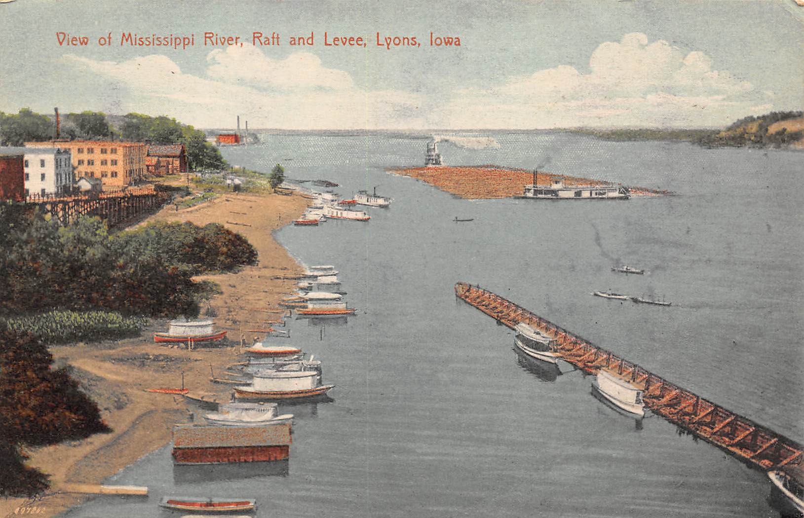 Lyons Iowa View Of Mississippi River, Raft & Levee, Vintage Postcard U16995