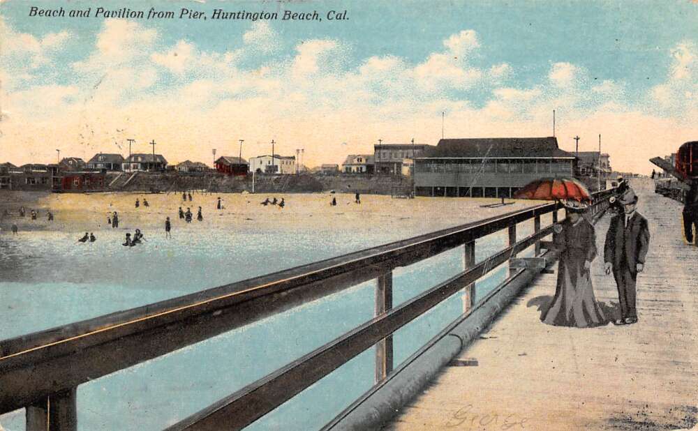 Huntington Beach California Beach and Pavilion from Pier Postcard AA73676