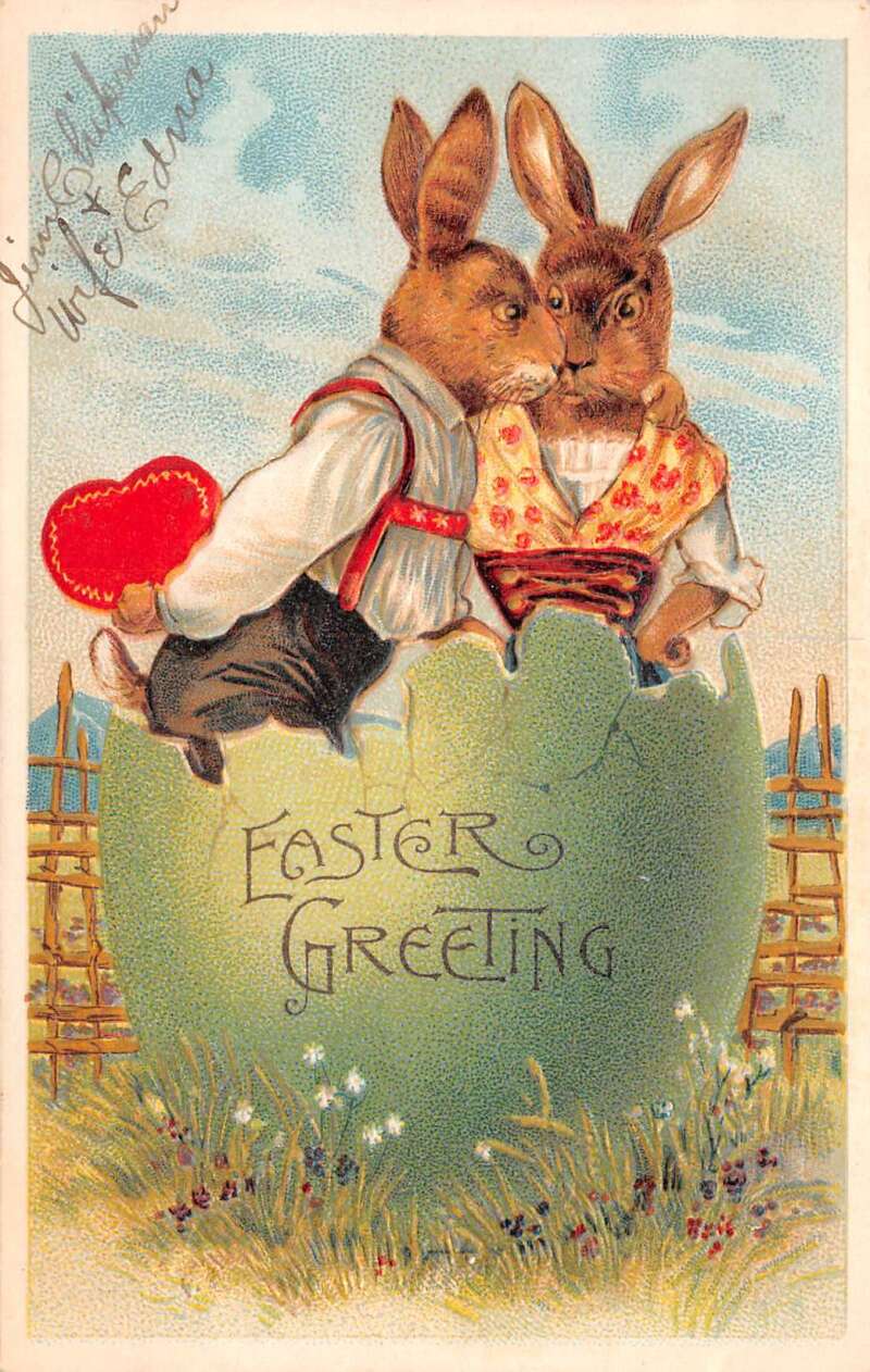 Easter Greetings Dressed Bunny Rabbits in Egg Vintage Postcard AA73217