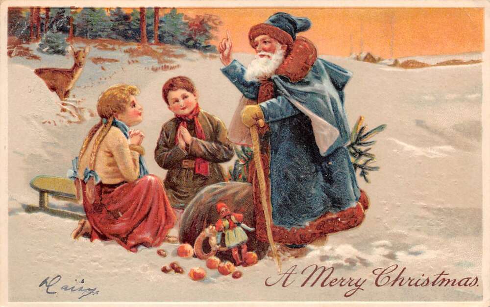 Christmas Greetings Santa Claus Blue Robe Childern PFB Postcard AA73222