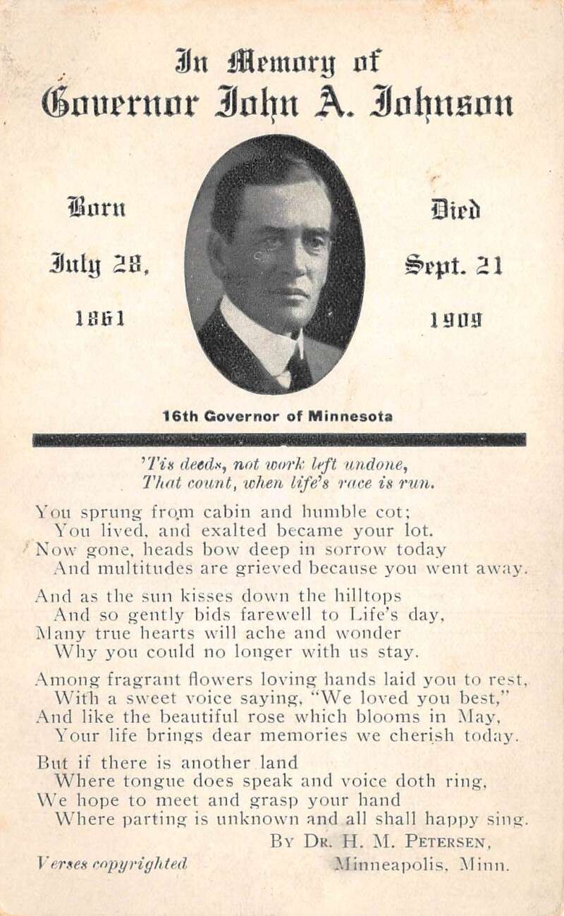 16th Governor Minnesota John A Johnson In Memory Of Vintage Postcard AA108907