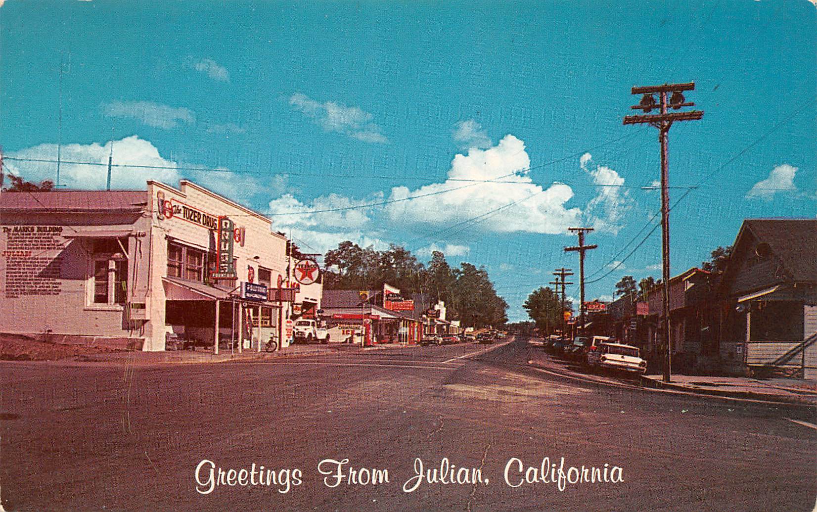 Julian California Town Scene, Texaco Sign, Drug Store, Vintage Postcard U12153