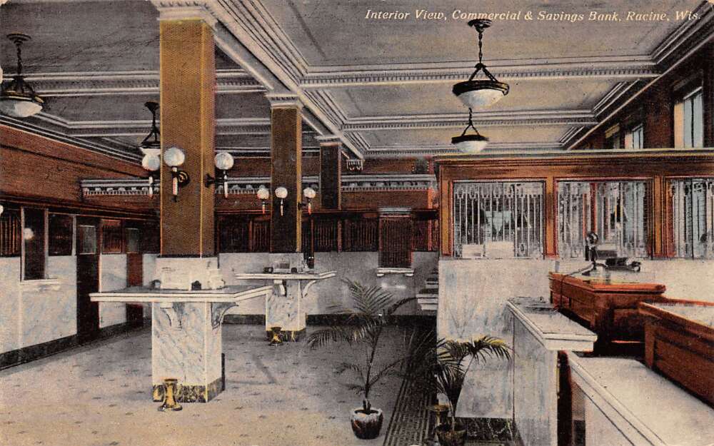 Racine Wisconsin Commercial and Savings Bank Interior Vintage Postcard AA79194