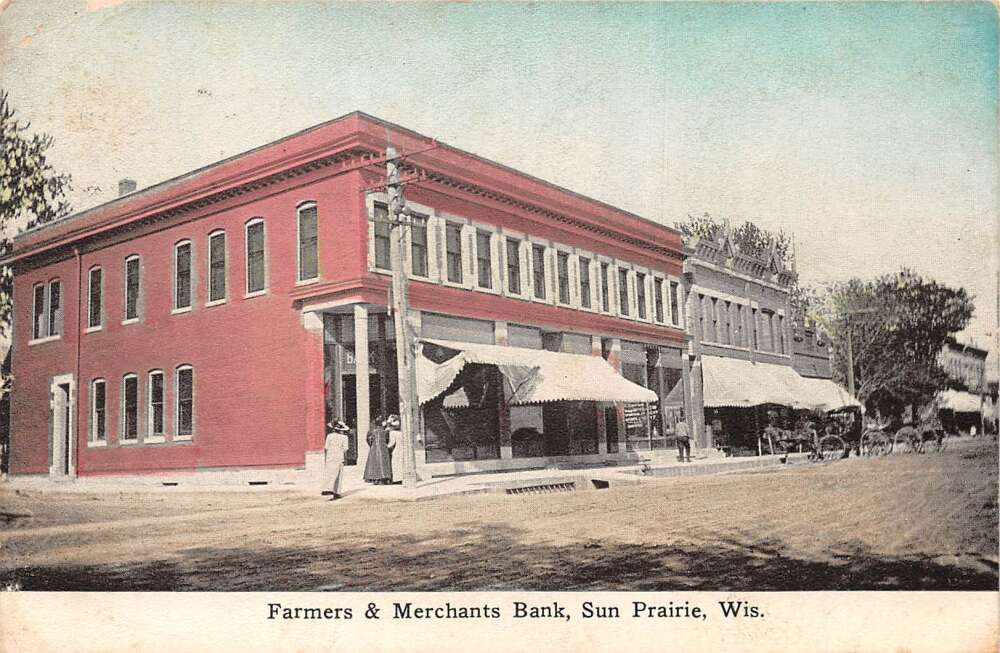 Sun Prairie Wisconsin Farmers and Merchants Bank Street Scene Postcard AA79195