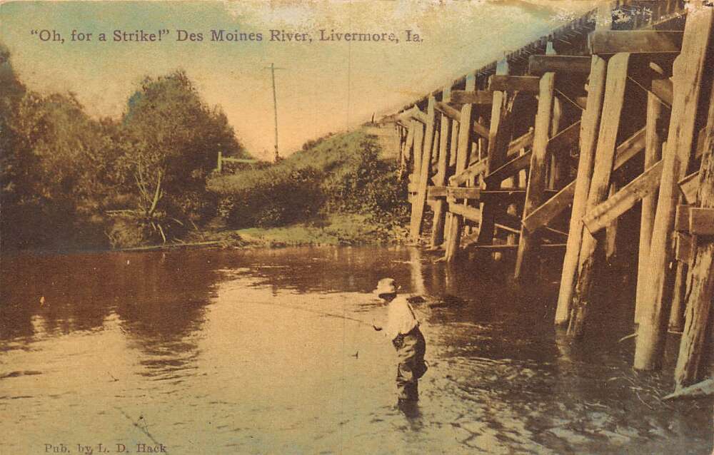 Livermore Iowa Fishing Scene, Des Moines River, Color Lithograph PC U15923