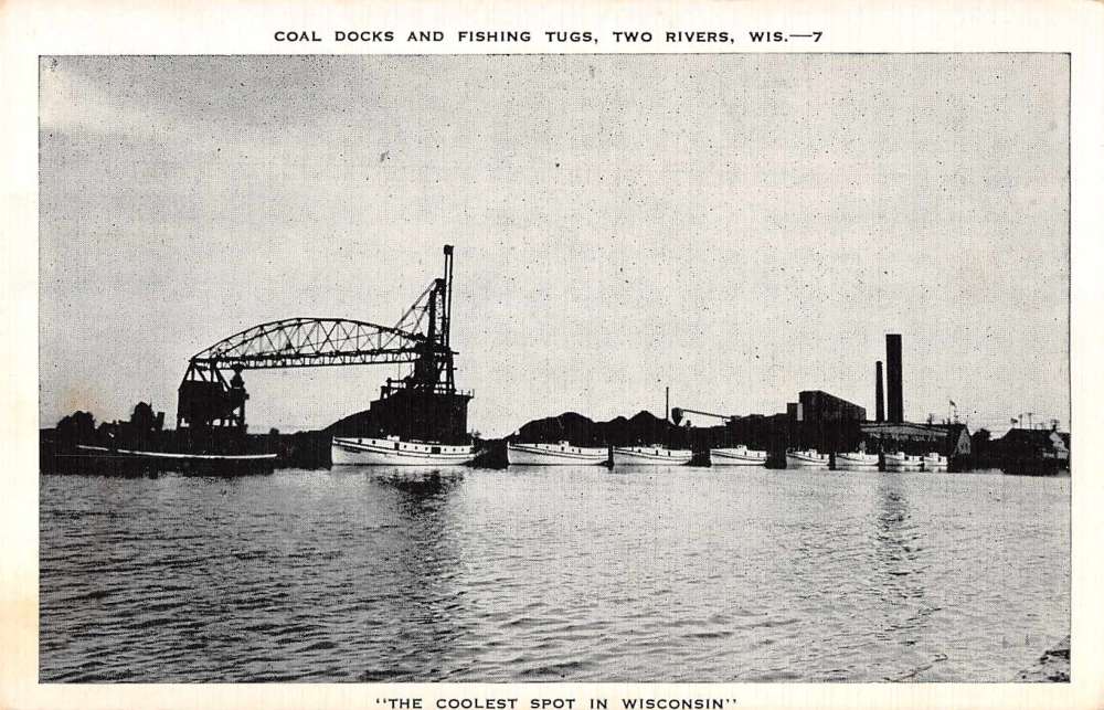 Two Rivers Wisconsin boats bridge coal docks and fishing tugs vintage pc Z43947