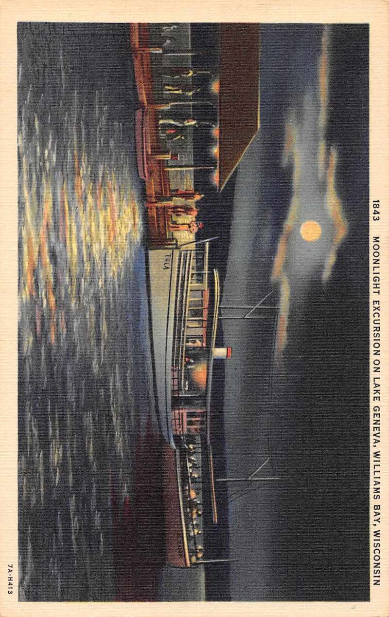 Williams Bay Wisconsin Lake Geneva Moonlight Boat Linen Antique Postcard J69932