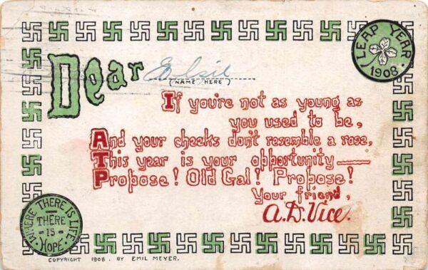 1908 Leap Year Greetings Swastika Border Vintage Postcard AA101479