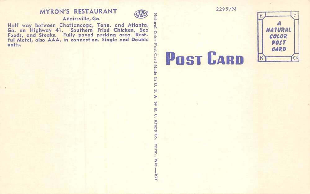 Adairsville Georgia Myron’s Restaurant Vintage Postcard AA65770