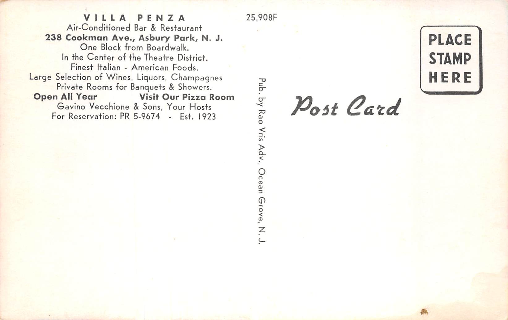 Asbury Park New Jersey Villa Penza Restaurant, Chrome, Vintage Postcard U26795