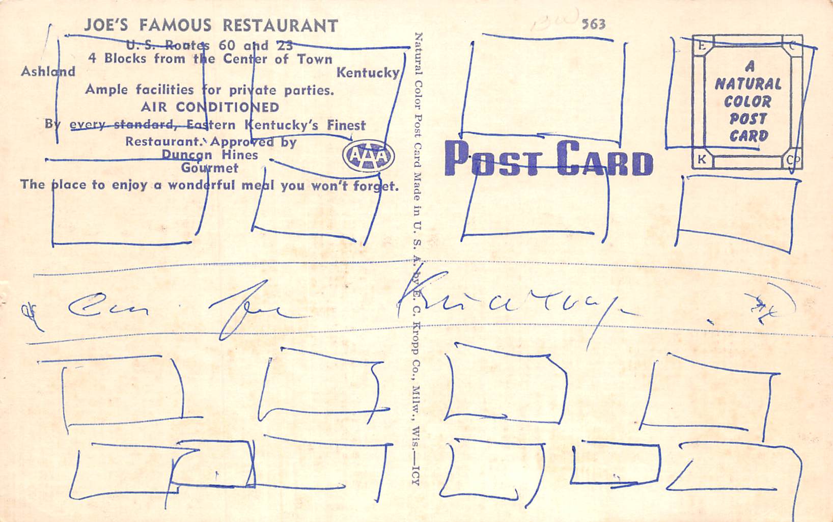 Ashland Kentucky Joe’s Famous Restaurant, Linen, Vintage Postcard U26833