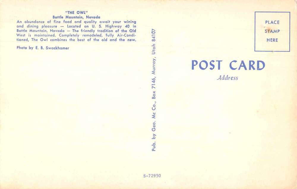 Battle Mountain Nevada The Owl Restaurant Vintage Postcard JE359845