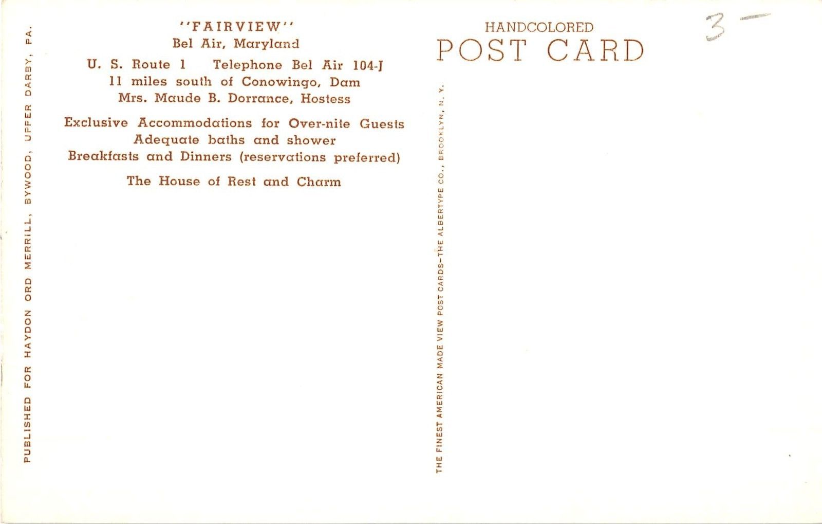 Bel Air Maryland Fairview House of Rest & Charm Antique Postcard (J8418) Good Condition.