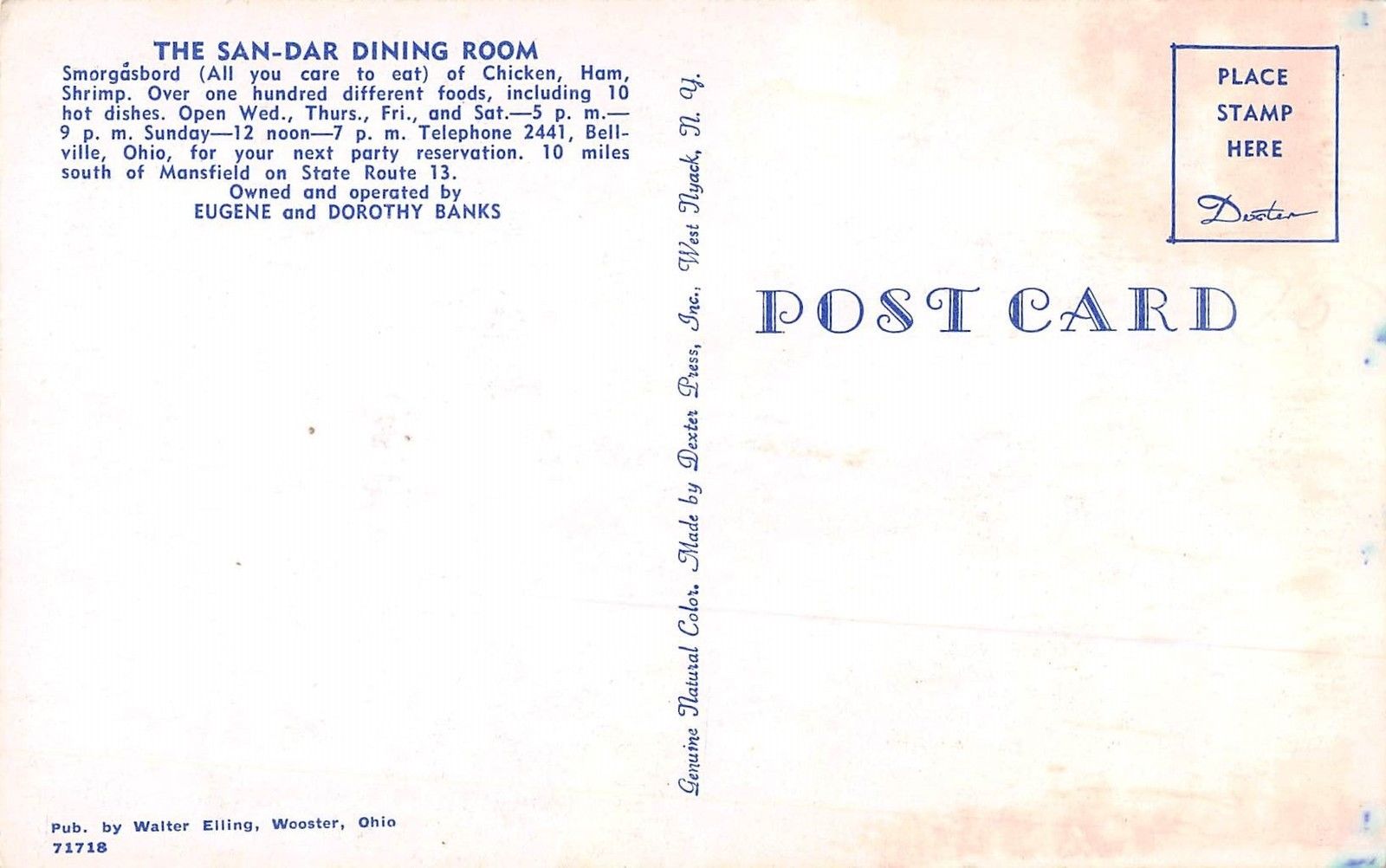 Bellville Ohio San-Dar Dining Room Restaurant Vintage Postcard (J29665) Good Condition.