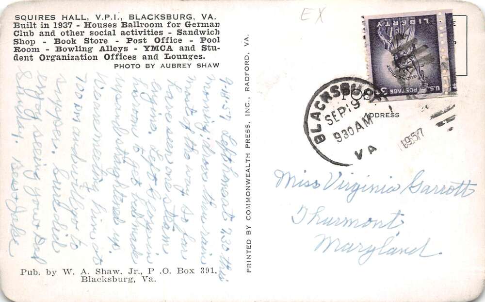 Blackburg Virginia VPI Polytechnic Insitute Suqires Hall Postcard AA112449