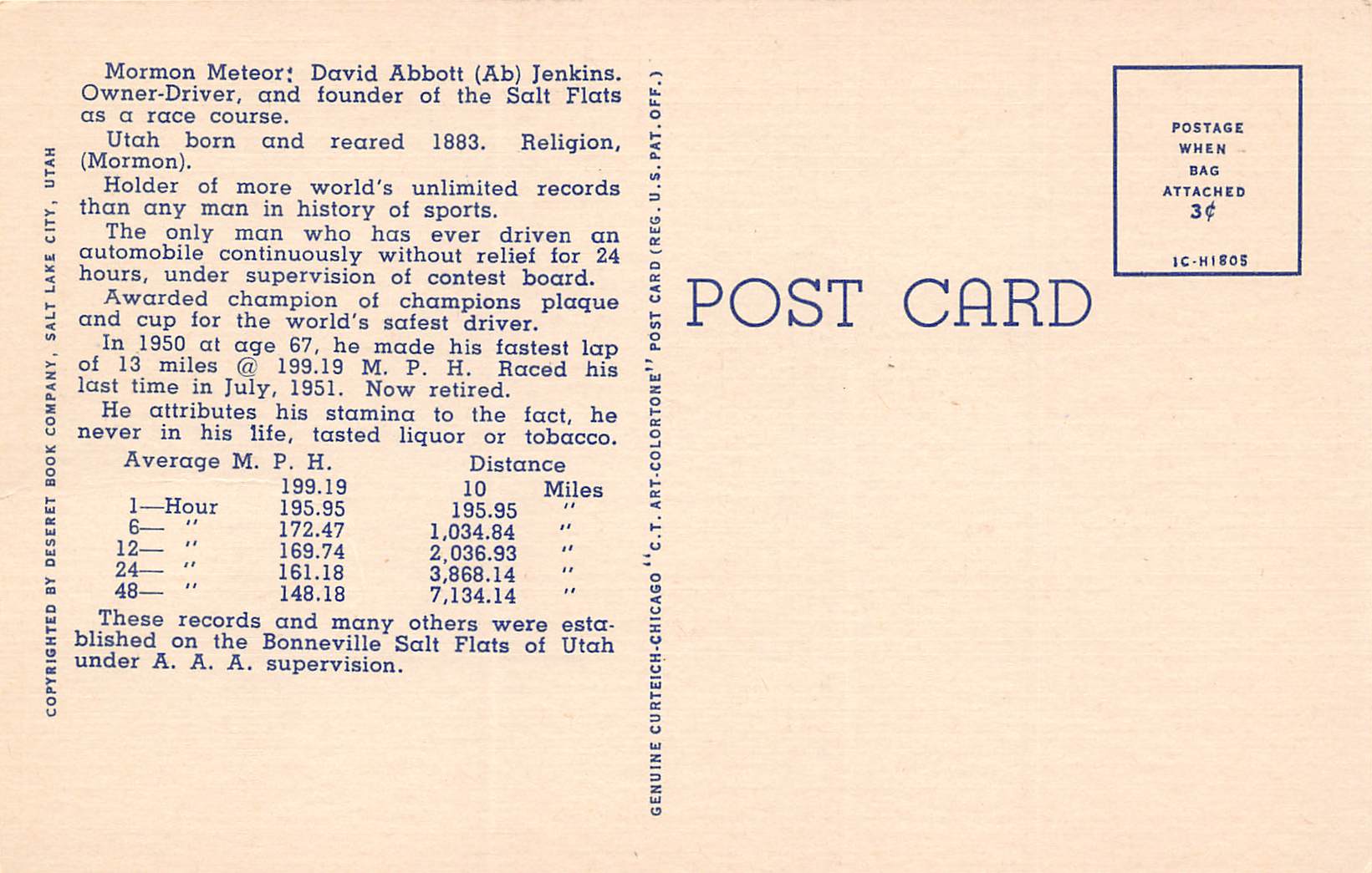 Bonneville Salt Flats Utah Mormon Meteor, Unlimited Speed Record Maker Car,PC U11337