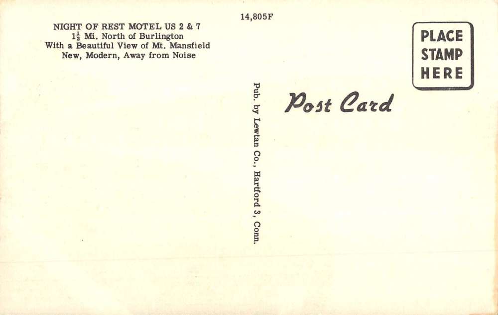 Burlington Vermont Night Of Rest Motel Street View Antique Postcard K65609