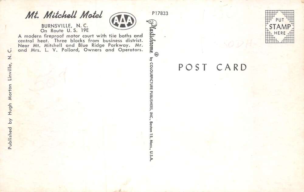 Burnsville North Carolina Mt Mitchell Motel Vintage Postcard AA71986