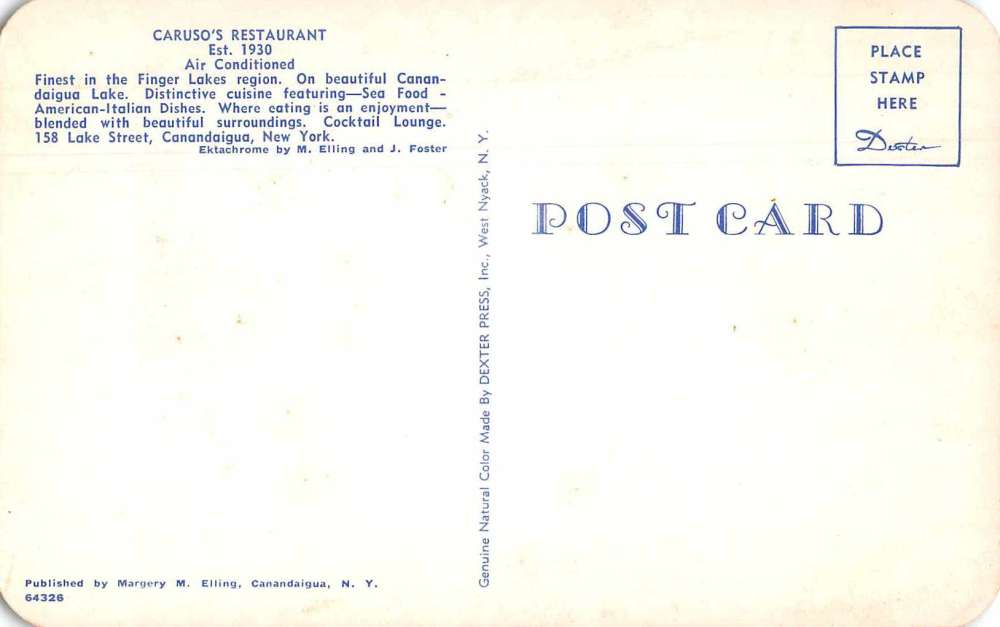 Canadaigua New York Caruso’s Restaurant Interior and Exterior Postcard J73388