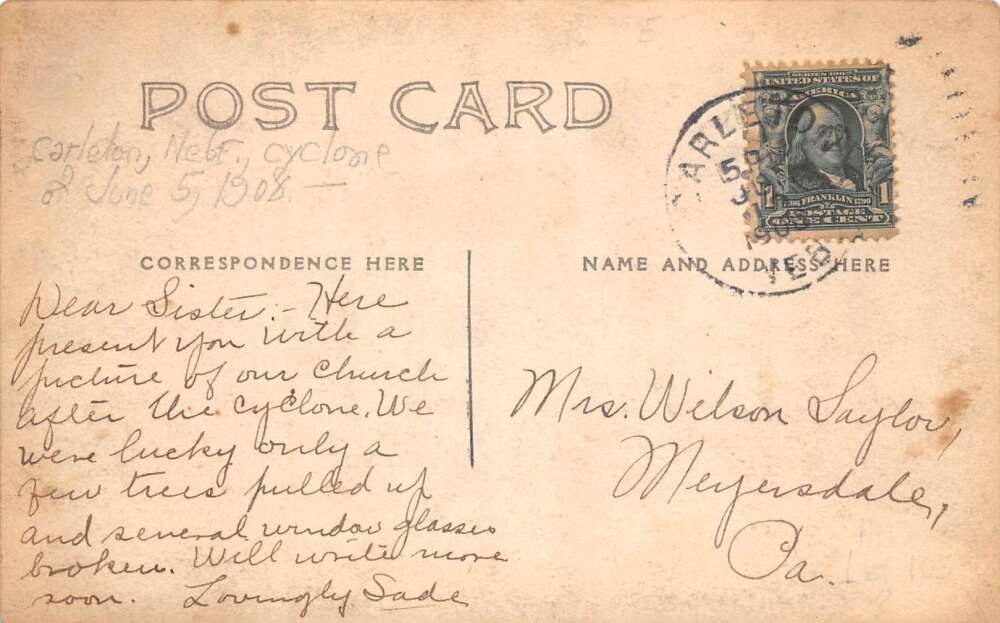 Carleton Nebraska Church Ruins Tornado Disaster Real Photo Postcard AA106219