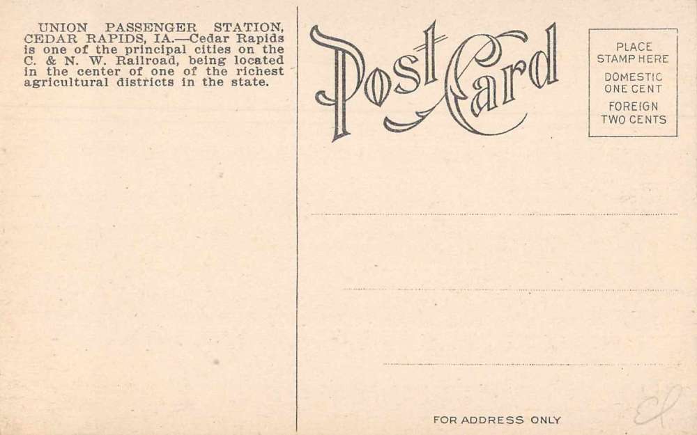 Cedar Rapids Iowa Union Passenger Station Antique Postcard J80951