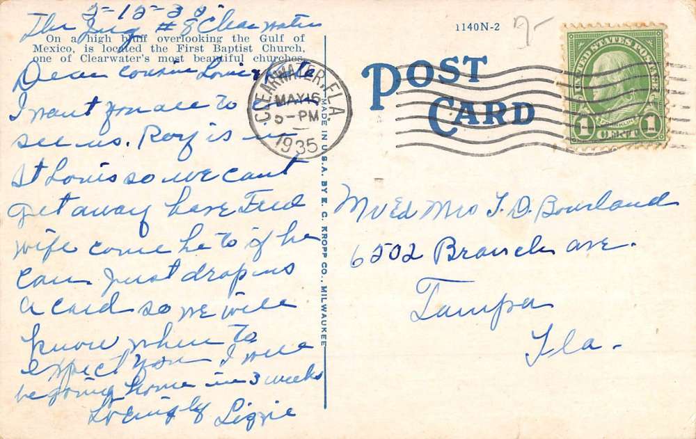 Clearwater Florida First Baptist Church Street View Antique Postcard K70581