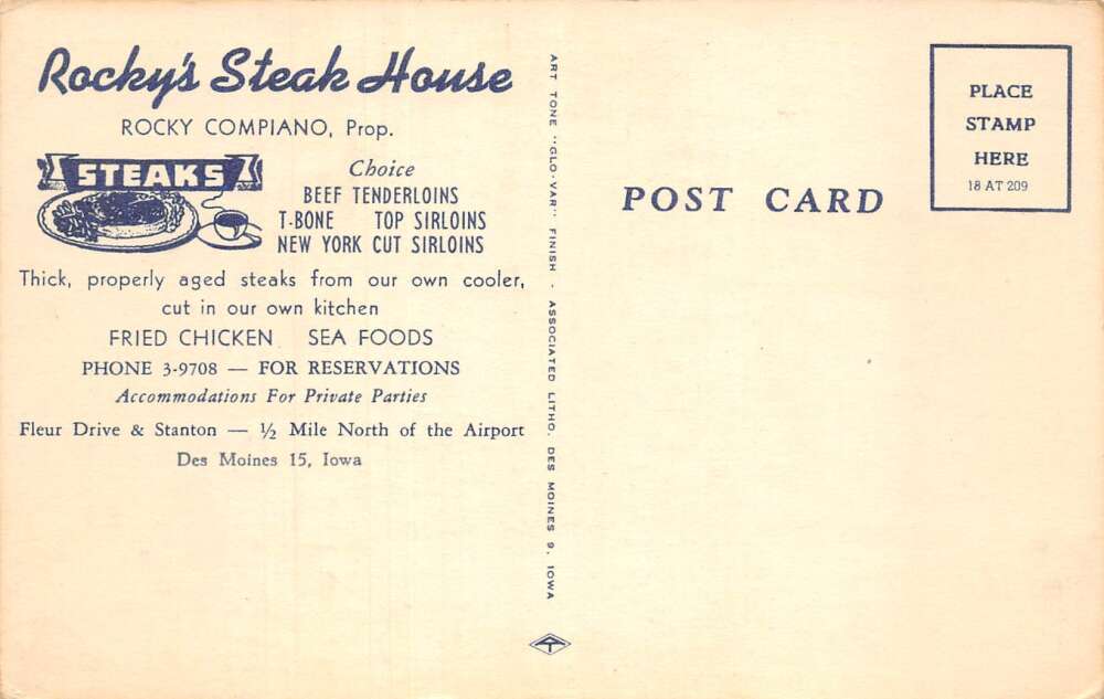 Des Moines Iowa Rocky’s Steak House Vintage Postcard AA112451