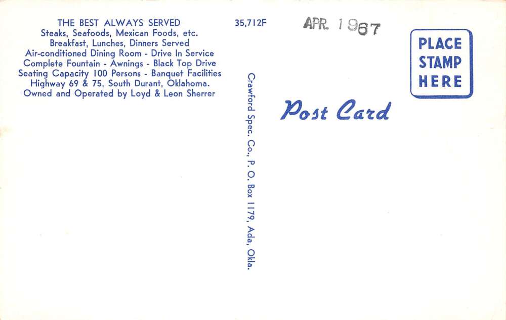 Durant Oklahoma Sherer’s Restaurant Vintage Postcard AA110961
